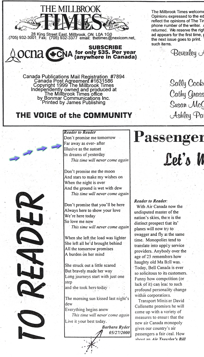 Barbara Ryder's poem " THIS TIME WILL NEVER COME AGAIN" published Millbrook Times