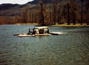 Some people thought this would not work. Well Soke Verkerke's platoon showed them different. They straped three 45gallon drums on each side of the jeep, then drove the jeep across the lake. |