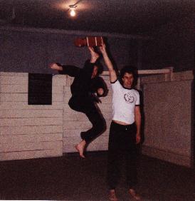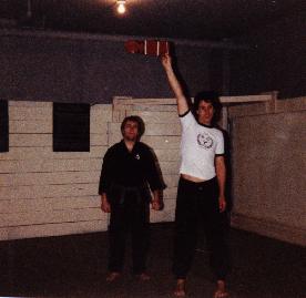 Soke Verkerke demonstrates a jumping front snap kick. The student who is holding the pad is 6ft. 5inches and is holding the pad up 8ft.