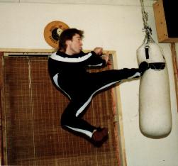 Soke Verkerke on the way up for a side kick. Hombu Dojo 1985