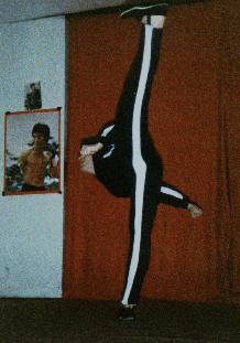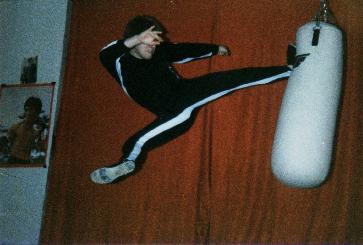 Soke Verkerke on his way down from a jumping side kick Hombu Dojo 1984