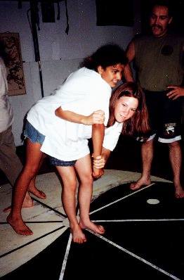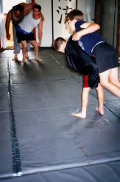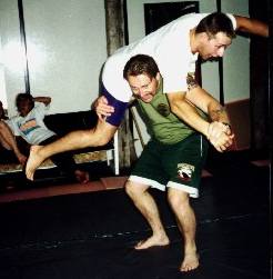 In the forefront, Chris Ferguson performing a hip throw on Casey