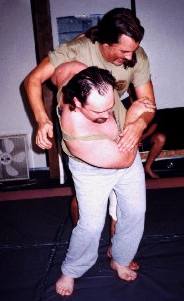 Above (L) Neil Westlake throws Fred Renkewitz.