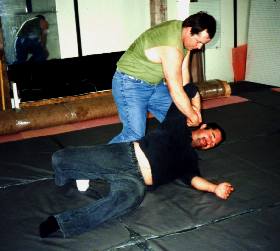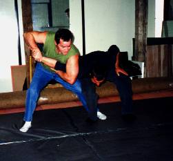 Matt steps behind Daniels leg while pulling Daniel's arm across his