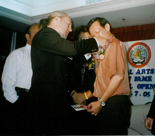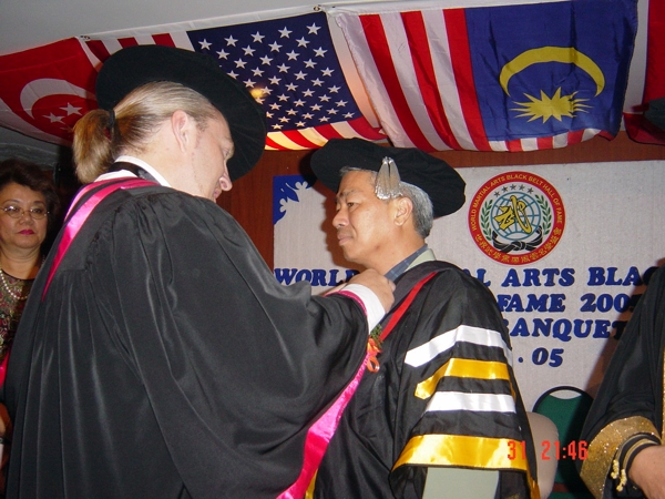 GM. Daniel Verkerke is presenting Prof. Dr. Song Swee Hee with the Provincial pin of Ontario during the Grand Opening Ceremony for the World Martial Arts Black Belt Hall of Fame. Dr. Song's accomplishments are too long to list here. Simply he is Chairman for the Martial Arts Federation of Malaysia. |