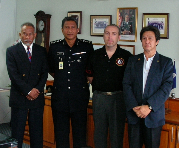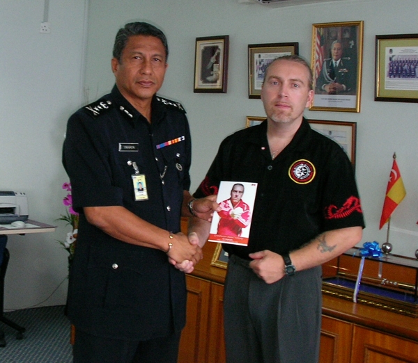 Verkerke, Dr. Song On the second day GM. Daniel Verkerke was introduced to the Chief of Police Dato' Yahaya Udin for the State of Selangor which has a population of 4.5 million. The afternoon was spent talking about the N.V.S. program that GM. Verkerke teaches to the Sheriff's Department in USA. This program teaches Non Violent System of movements used to control and restrain. Also topics of retractable baton, pepper spray and gun control were discussed. |